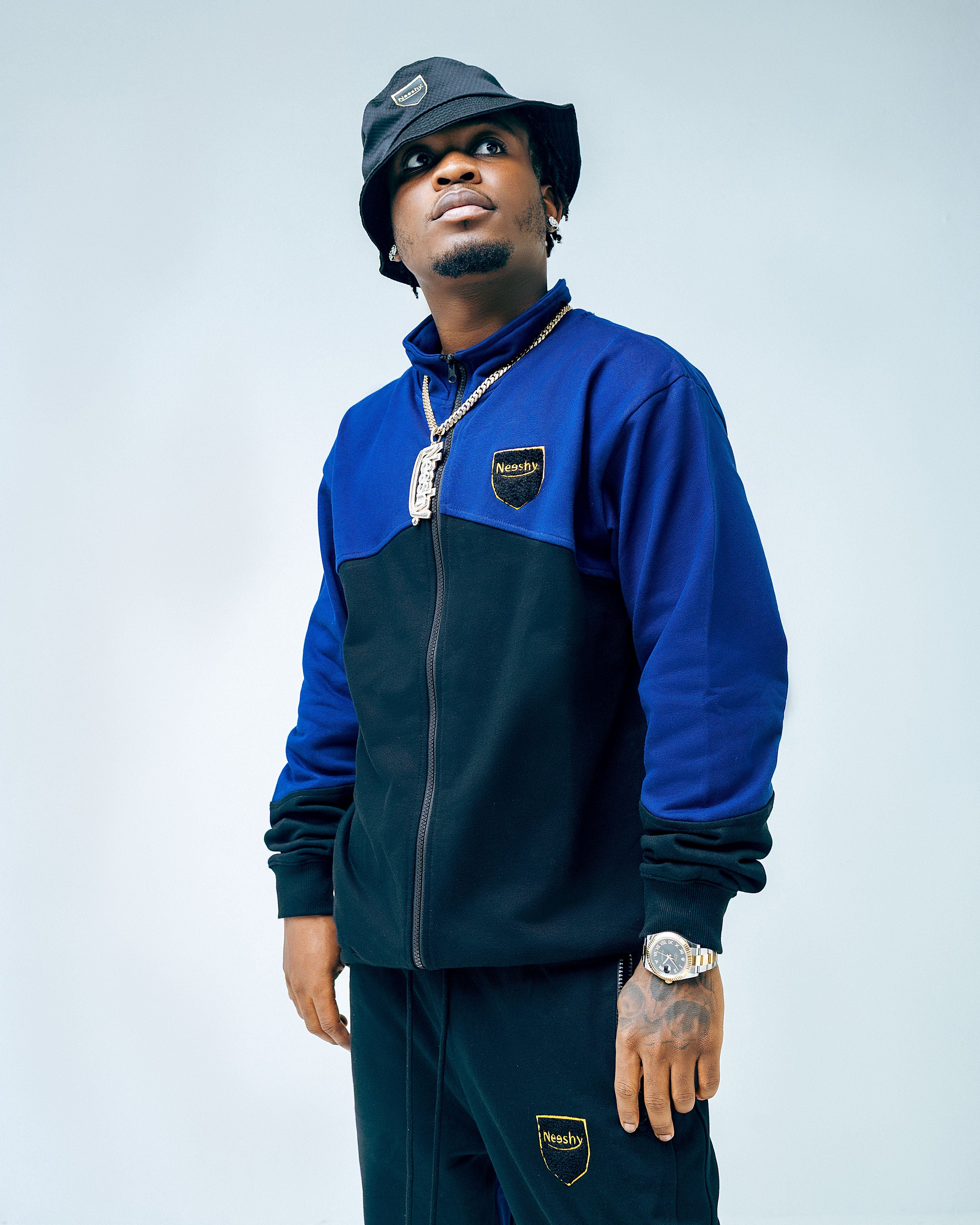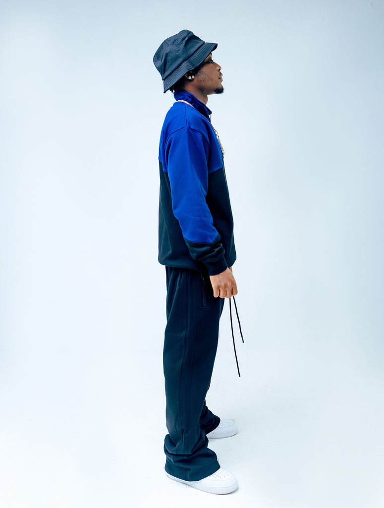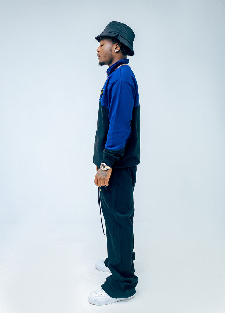 French Terry Cloth fabric tracksuit set with zippers. The Neeshy crest is embroidered with Chinelle embroidery. Pants are flared and stacked.