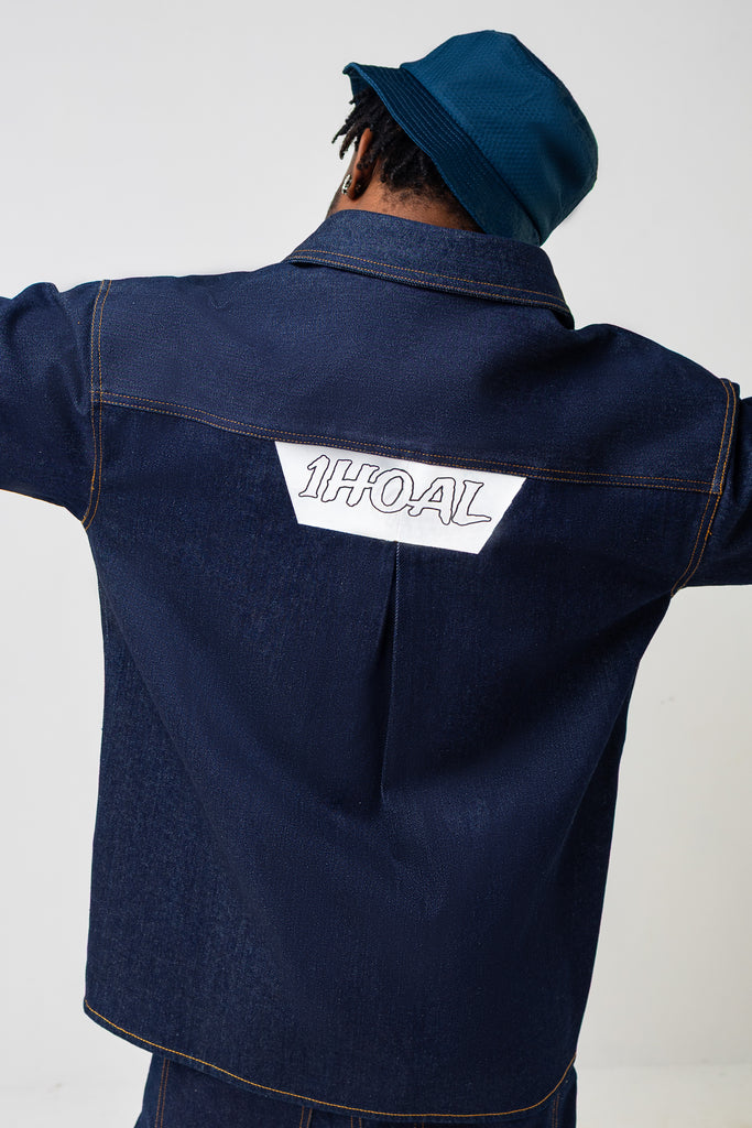 Japanese Raw blue Jeans Denim set. Pants are flared and stacked with 1HOAL printed on side of pocket. Jeans top has a custom oversized fit with 1HOAL printed at the back.
